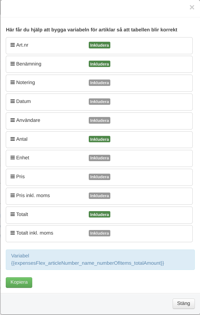 Vi har en hjälp för att bygga variabeln, se nedan. När man har valt de kolumner man vill visa så är det bara att kopiera variabeltexten och klistra in i mallen.
