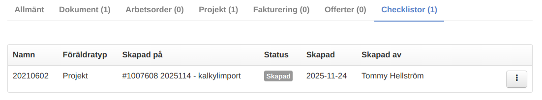 Under fliken "Checklistor" när man är inne på ett objekt så kan man nu se eventuella checklistor från "kopplade" projekt / arbetsordrar.