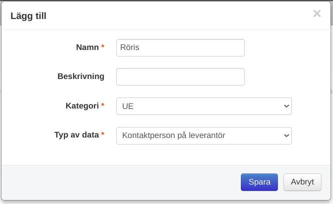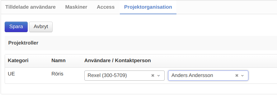 Därefter så kommer ni att kunna välja leverantör/kontaktperson när ni är inne i "Projektorganisation" under ett projekt: