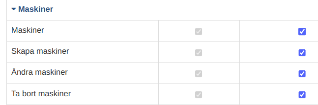 Nu finns tre nya behörigheter i sektionen "Maskiner".