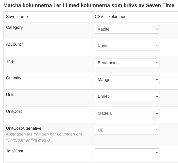 Innan själva importen så mappar ni kolumnerna från Excel-filen med det som Seven Time vill ha. Det enda fältet som krävs är "Konto". i rekommenderar att ni väljer "Förhandsgranska" innan importen men vi har även lagt till funktionen "Ta bort alla raderna" ifall något skulle gå fel.