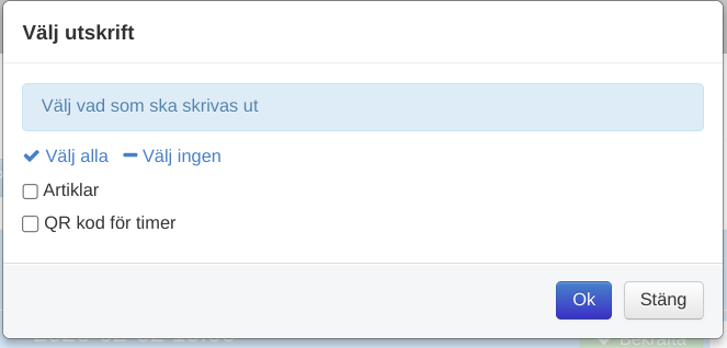 Nu finns möjlighet att skriva ut en QR-kod för att starta/stoppa en timer när ni väljer att skriva ut en arbetsorder. Välj mallen "Standard" och då visas dialogen nedan: