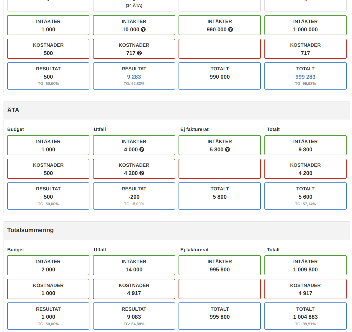 Om ni använder inställningen "Separera kostnad och intäkt från ÄTA så att den inte visas tillsammans med "huvudprojektet", dvs, det fasta priset, i projektekonomin" som finns i "Inställningar -> Projekt -> Allmänt" så kommer ni märka att informationen för de olika "sektionerna" innehåller samma information: "Budget", "Utfall", "Ej fakturerat" och "Totalt".