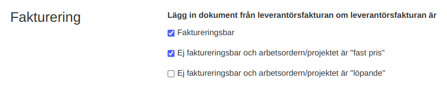 Vi har tidigare haft möjligheten att kunna ta med dokument från "Ej faktureringsbara" leverantörsfakturor om ni har fakturerat ett projekt eller en arbetsorder som har haft "Fast pris". Nu har vi utökat detta till att även innefatta löpande projekt/arbetsordrar. Vi har lagt till nya inställningar under "Inställningar -> Leverantörsfakturor -> Allmänt" där ni kan ställa in precis så som ni vill ha det.