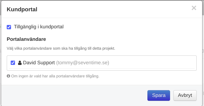Det är nu möjligt att styra vilka projekt och arbetsorder en kundportalsanvändare har tillgång till på projekt-/arbetsordernivå, istället för enbart på kundnivå. Konfigureras direkt inne på respektive projekt eller arbetsorder.