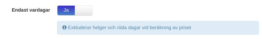 Det är nu möjligt att räkna uthyrning i byggdagar, det vill säga att helgdagar och röda dagar exkluderas från beräkningen. I "Inställningar → Uthyrning → Allmänt" ställer man in vilket standardvärde man vill ha men när man är inne på en uthyrning så går det att ändra (visas nedan).