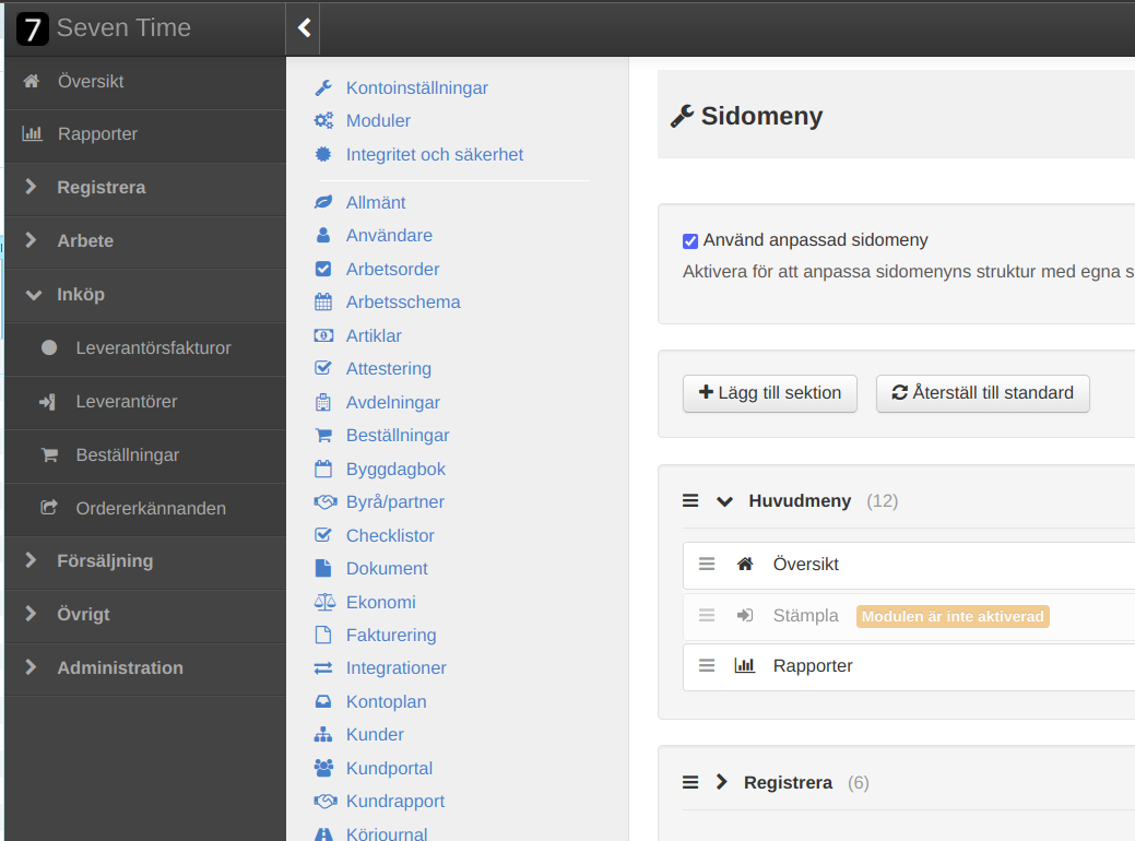Det är nu möjligt att skapa egna sektioner i sidomenyn och välja vad som ska visas i respektive sektion. Aktiveras under "Inställningar → Sidomeny" via inställningen "Använd anpassad sidomeny". Se ett exempel nedan.